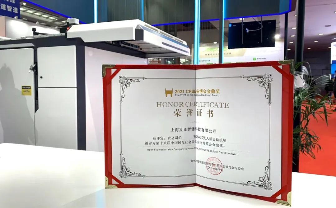 復亞智能攜智方A30固定式無人機機場和智方S10小型無人機機場亮相展位,向到場領導、行業專家及與會觀眾展現無人機全自動巡邏巡檢系統在公共安全行業的價值與前景,獲得安博會最高榮譽獎“金鼎獎”以及“2021中國智慧城市建設推薦品牌”。